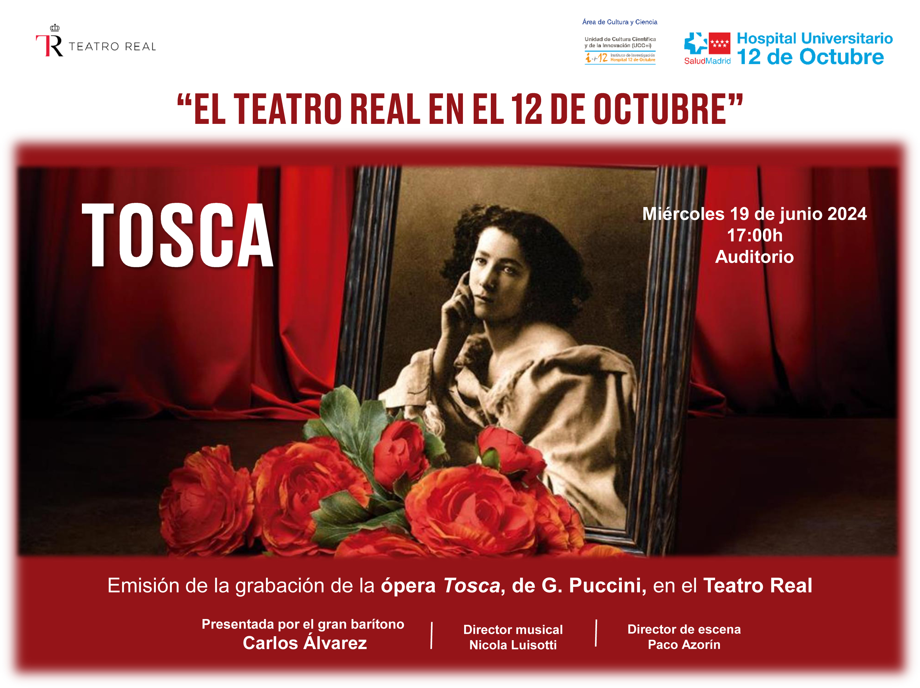 La ópera Tosca grabada en el Teatro Real se emitirá en la pantalla del Auditorio del Hospital dentro de su programación cultural y contará con la presencia del gran barítono Carlos Álvarez que presentará la obra.